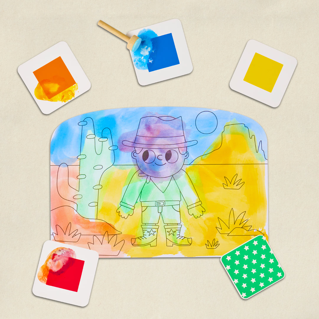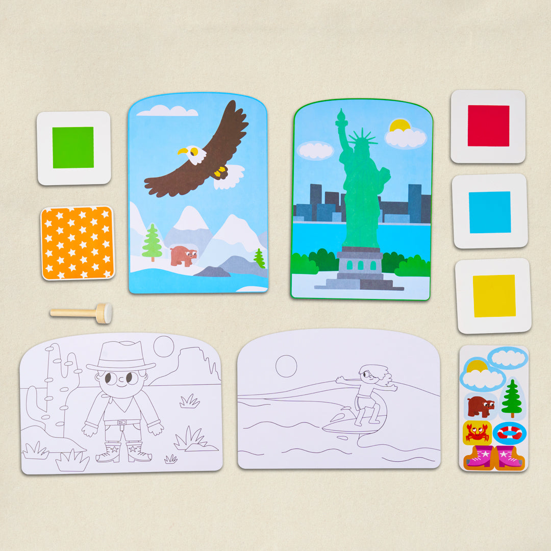 Coloriez et décorez ensemble quatre magnifiques illustrations des États-Unis grâce à de la peinture et des autocollants ! En manipulant le tampon pour peindre et en collant les formes, il développe sa motricité fine tout en découvrant les couleurs et en enrichissant son vocabulaire.