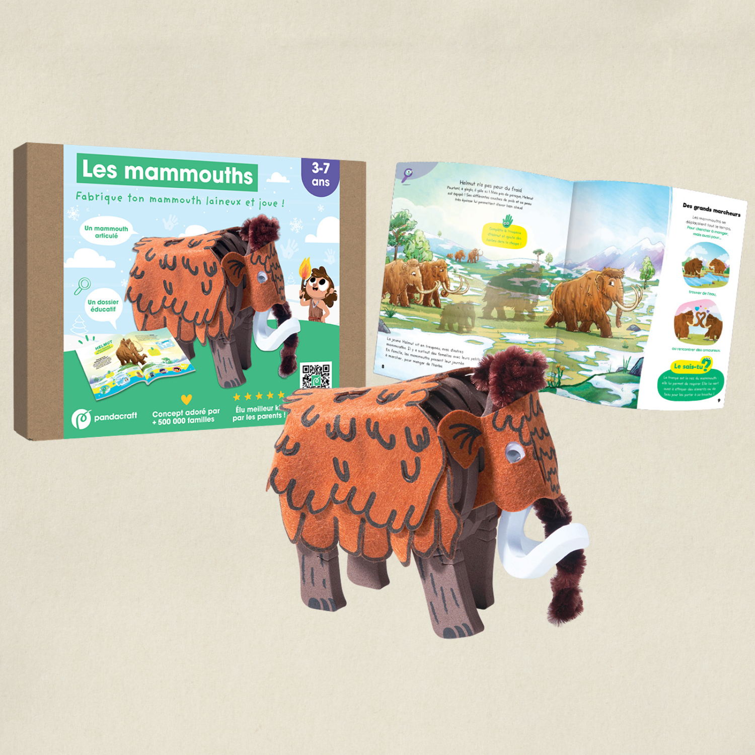 Très bonne idée pour offrir : ce kit est vendu dans une belle boite pour être plus facilement offert en cadeau ! Voyage au temps de la préhistoire à la rencontre d’Helmut et découvre à travers son histoire le mode de vie des mammouths laineux : où, quand et comment vivaient-ils, quels animaux côtoyaient-ils, et comment ont-ils disparu ? Assemble en plusieurs étapes ton mammouth laineux afin de comprendre ses caractéristiques principales (son squelette, ses poils, ses défenses, etc) puis joue avec en faisant bouger sa trompe et ses pattes articulées !