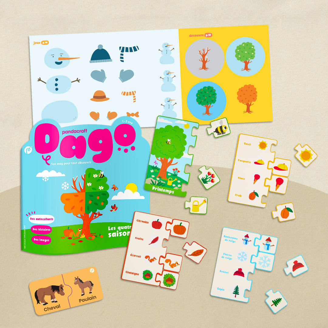 Observez les changements de saison et découvrez le vocabulaire associé (flocons, feuilles…). Grâce à 4 puzzles joliment illustrés, amusez-vous à coller ensemble les autocollants représentant des objets emblématiques de chaque saison, puis associez-les à la bonne période de l’année. Un jeu de logique et de vocabulaire pour partager, jouer et rejouer ! Vivez ensemble de doux moments en lisant et en jouant dans les autres rubriques de son magazine, 100% adapté dès 1 an, pour découvrir le monde en images et en mots.